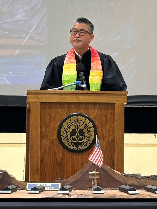 Rev. John Oda, formally dressed in a rainbow colored stoll as a visual for the rights of LGBTQIA+, gave the Aspiration at the 46th Annual Day of Remembrance commemoration event held on Feb. 15. Rather than a prayer, he recalled solemnly the impact Executive Order 9066 had on his then 9-year-old mother who saw her whole life upended and changed forever as a result of this racist act. The theme "Neighbors Not Enemies" and the work for justice by the people and the various local non-profits to see that this injustice never happens again promotes hope and not hopelessness.