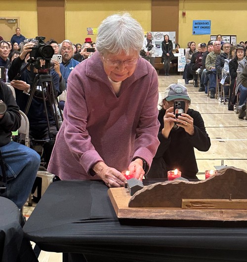 Alice Hikido and Its Yokota above were an integral part of the program as they were candlelighters representing the concentration camps where 120,000 Japanese were interned during World War II. Alice represented Minidoka seen here and Its represented Rohwer.